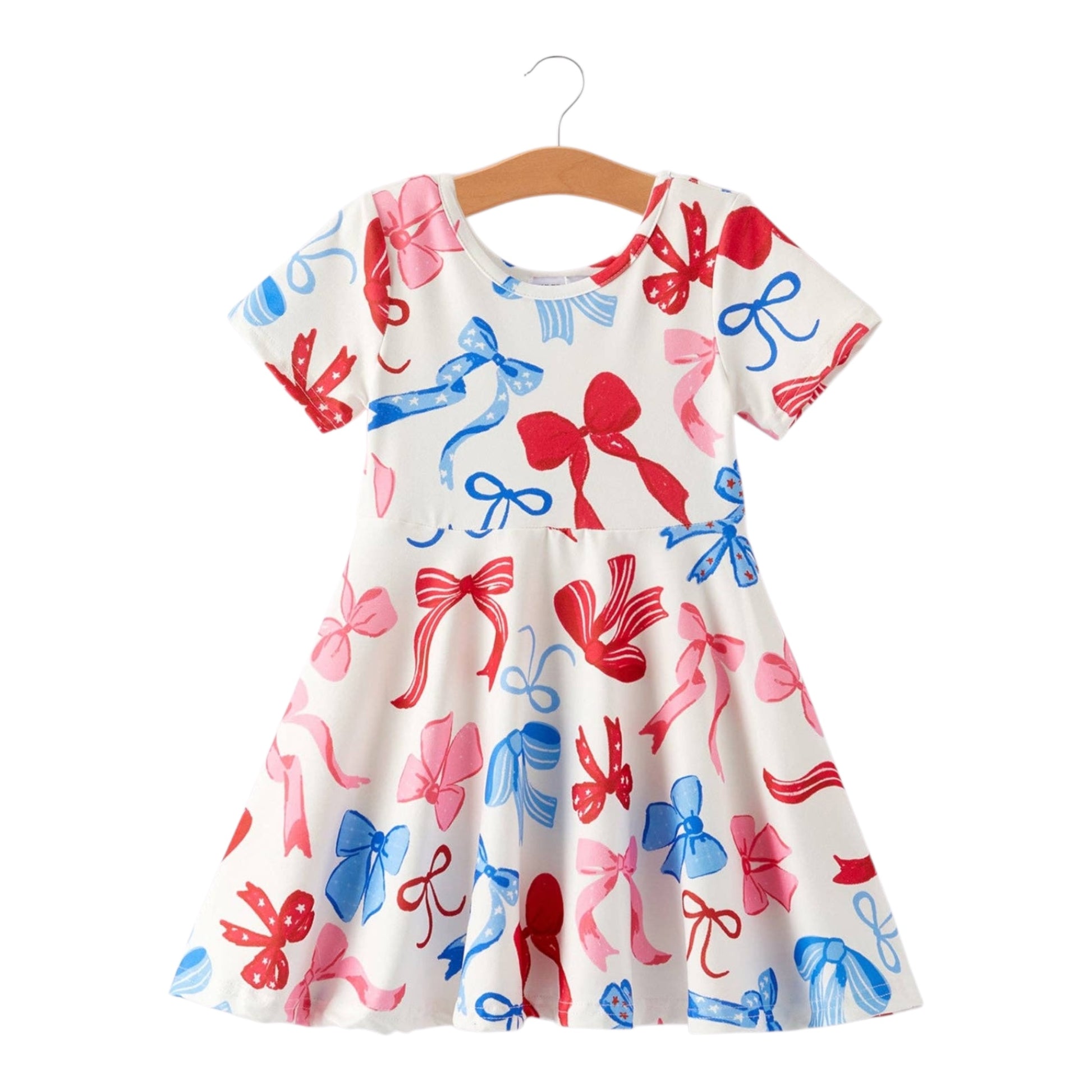Celebrate the 4th of July in style with this Color Bow Printed Short Sleeves Dress! Featuring a unique print and comfortable short sleeves, this dress is perfect for any Independence Day event. Show off your patriotic spirit while looking fashionable and feeling confident. Order now and make a statement this 4th of July!