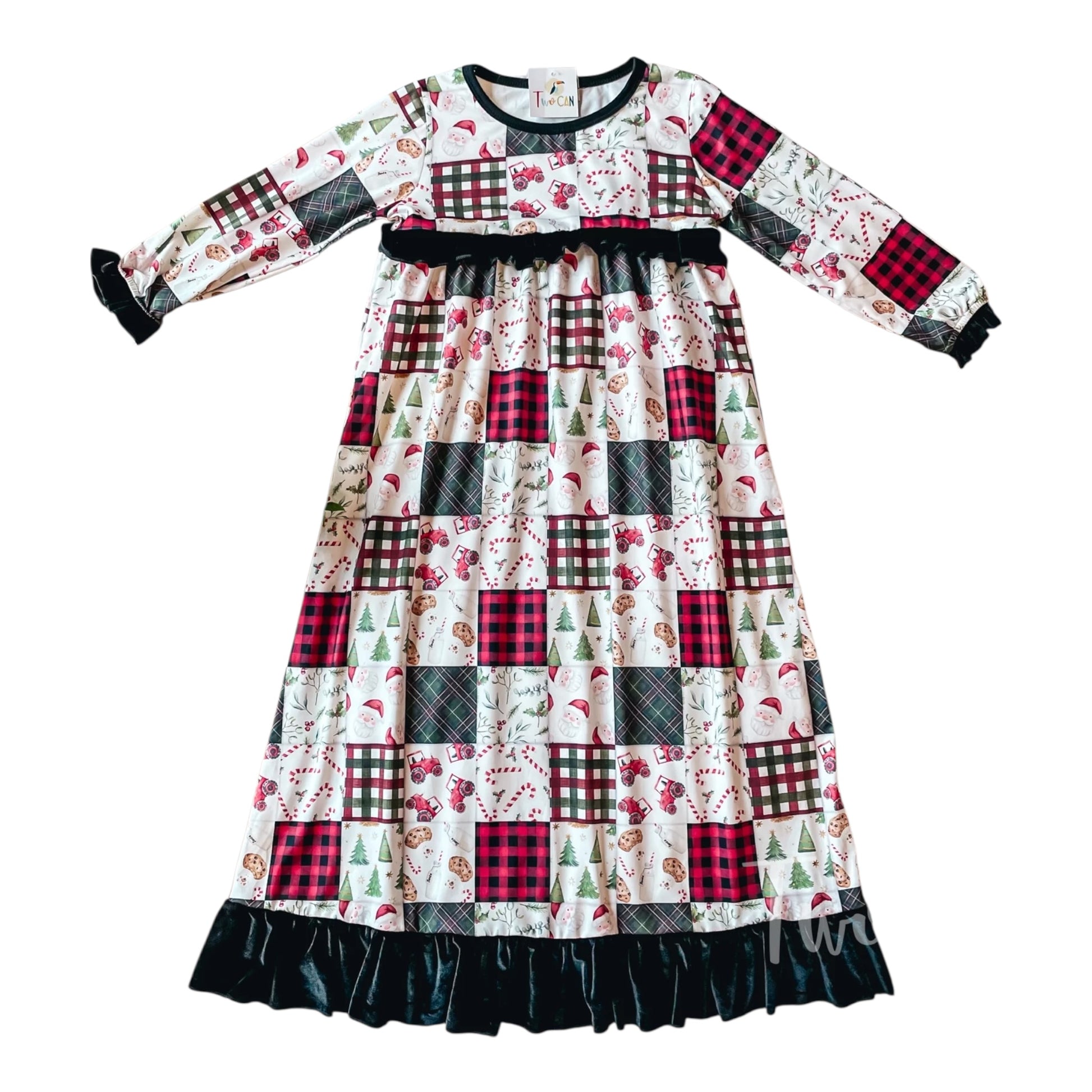 Make holiday memories extra special with our Farmhouse Christmas Nightgown! Designed in a festive patchwork print featuring candy canes, Santa faces, cookies, plaid, and Christmas trees, this nightgown is both charming and cozy. Made from ultra soft milk silk fabric, it keeps little ones comfortable all night long. The velvet trim accents on the waist and ruffled hem add an extra touch of elegance and holiday magic.