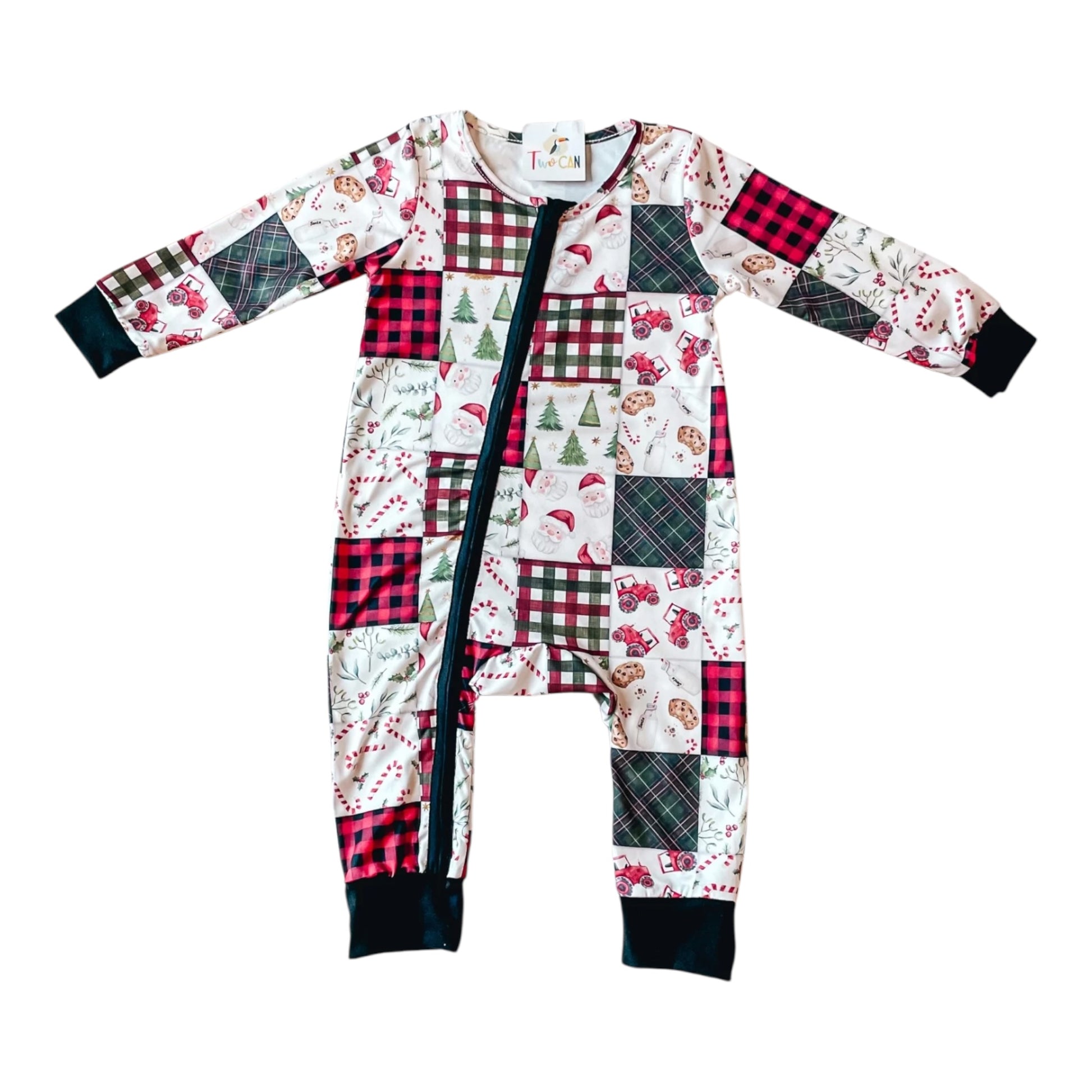 Bring farmhouse charm to the holidays with our Farmhouse Christmas Romper! Made from luxuriously soft milk silk fabric, this romper is perfect for cozy nights, festive mornings, and holiday photos. The patchwork design features plaid prints, candy canes, Christmas trees, cookies, Santa faces, and more, all the little details that make the season magical. With a full length zipper for easy changes and stretchy cuffs for comfort, it’s designed with both parents and little ones in mind.
