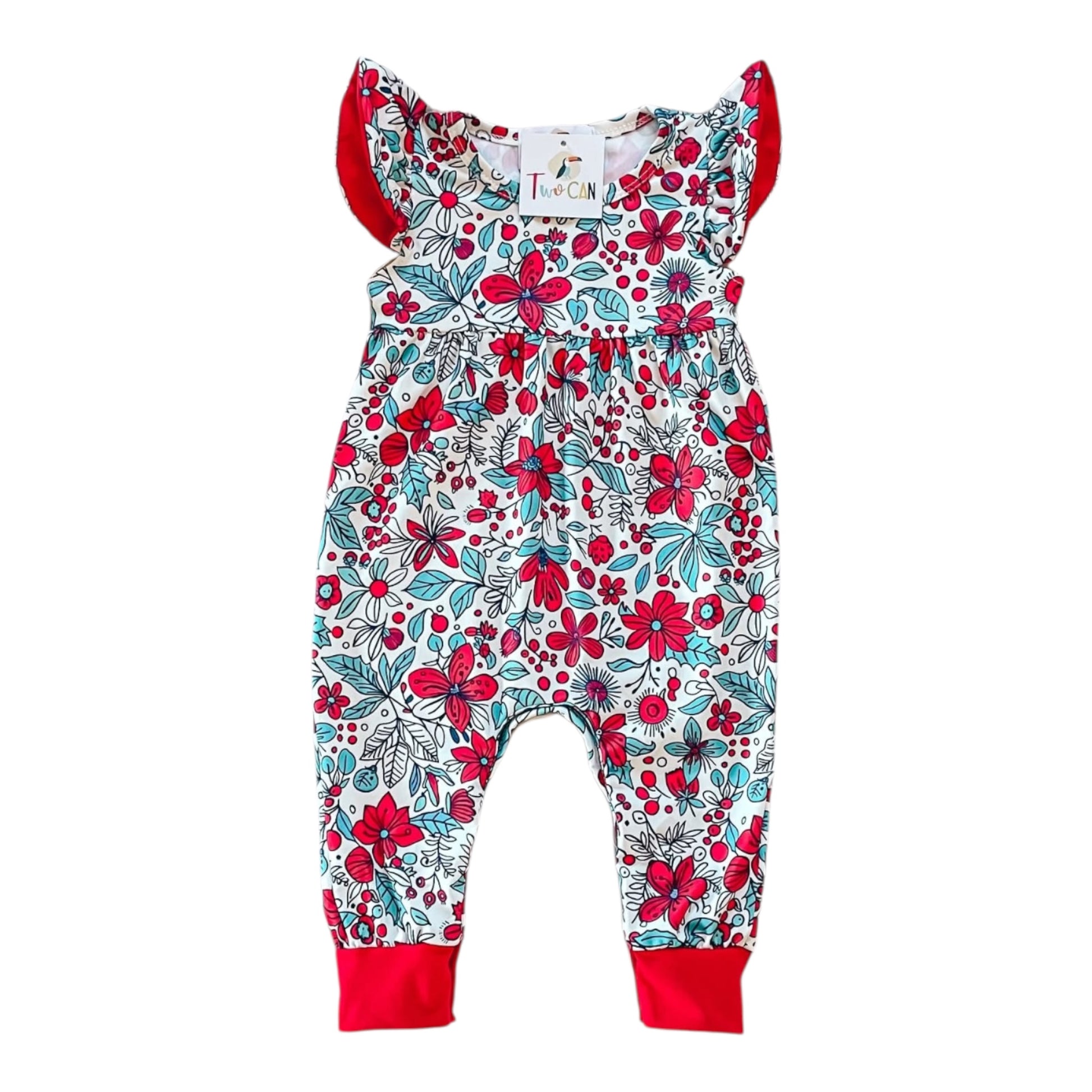 Bright, cheerful, and oh so soft. This Floral Romper is perfect for playtime, picture day, or everyday wear! Made from buttery smooth milk silk fabric, this romper features a vibrant floral print in shades of red, teal, and white that feels just as pretty as it looks. The flutter sleeves add a sweet touch of charm, while the red trim at the cuffs and shoulders gives it a festive pop.