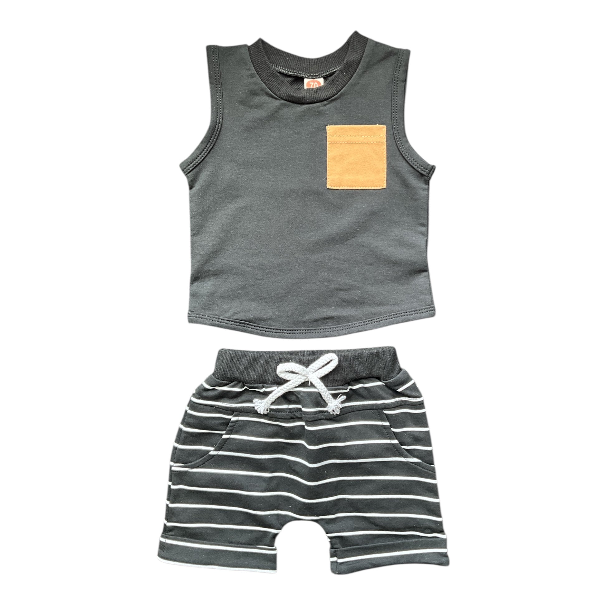 Let your little one play in style with this adorable two-piece summer set! Featuring a sleeveless black tank with a pop of contrast from the mustard chest pocket, paired with soft, striped drawstring shorts, this outfit is the perfect blend of trendy and practical.