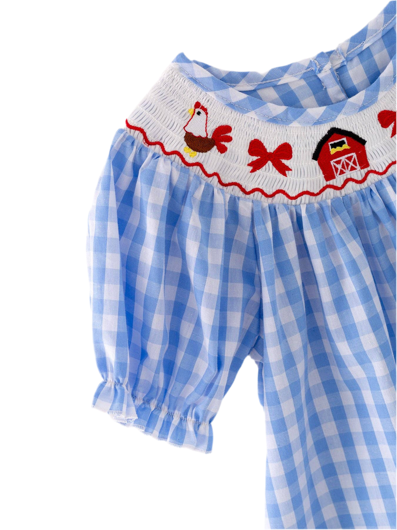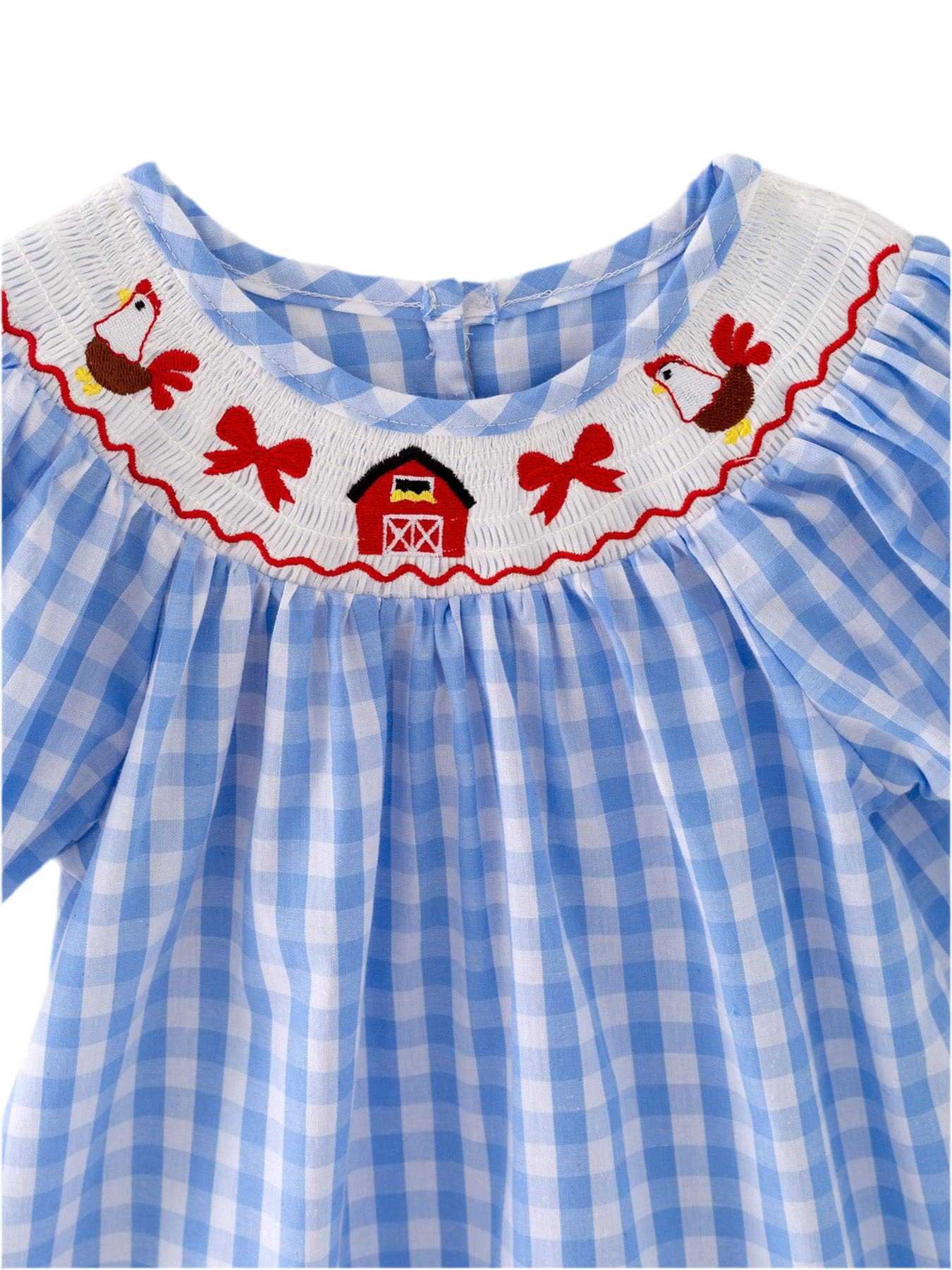 This Farm Blue Smocked Embroidered Dress is adorned with stunning smocking embroidery, bringing a touch of charm to your little one's look. Made with high-quality fabric, this dress is comfortable, stylish, and perfect for any outing or event. Perfect for any farm girl. Who doesn't love chickens on the farm? Don't miss out on this must-have addition to your child's wardrobe!