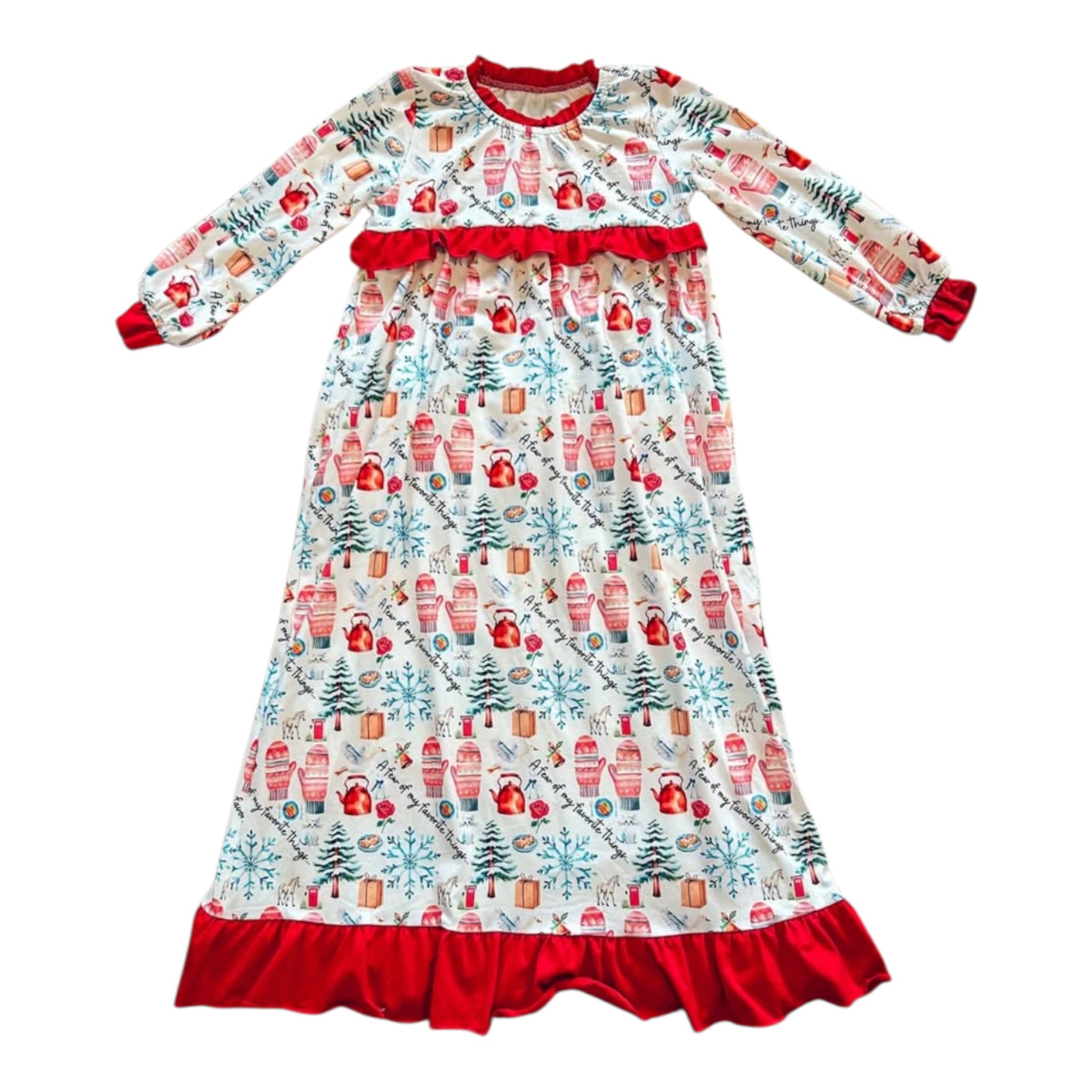 Make bedtime magical this holiday season with our Favorite Things Christmas Nightgown! Crafted from ultra soft milk silk fabric, this gown keeps your little one cozy while still feeling light and breathable. The festive print features holiday favorites like snowflakes, trees, mittens, and more, making it perfect for Christmas mornings, holiday photos, and sweet winter dreams. With red trim accents and ruffle details, this nightgown blends comfort and style for a picture-perfect holiday look.