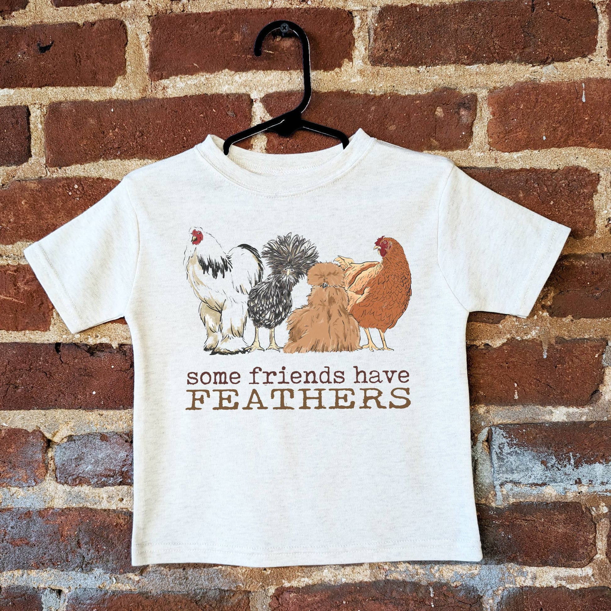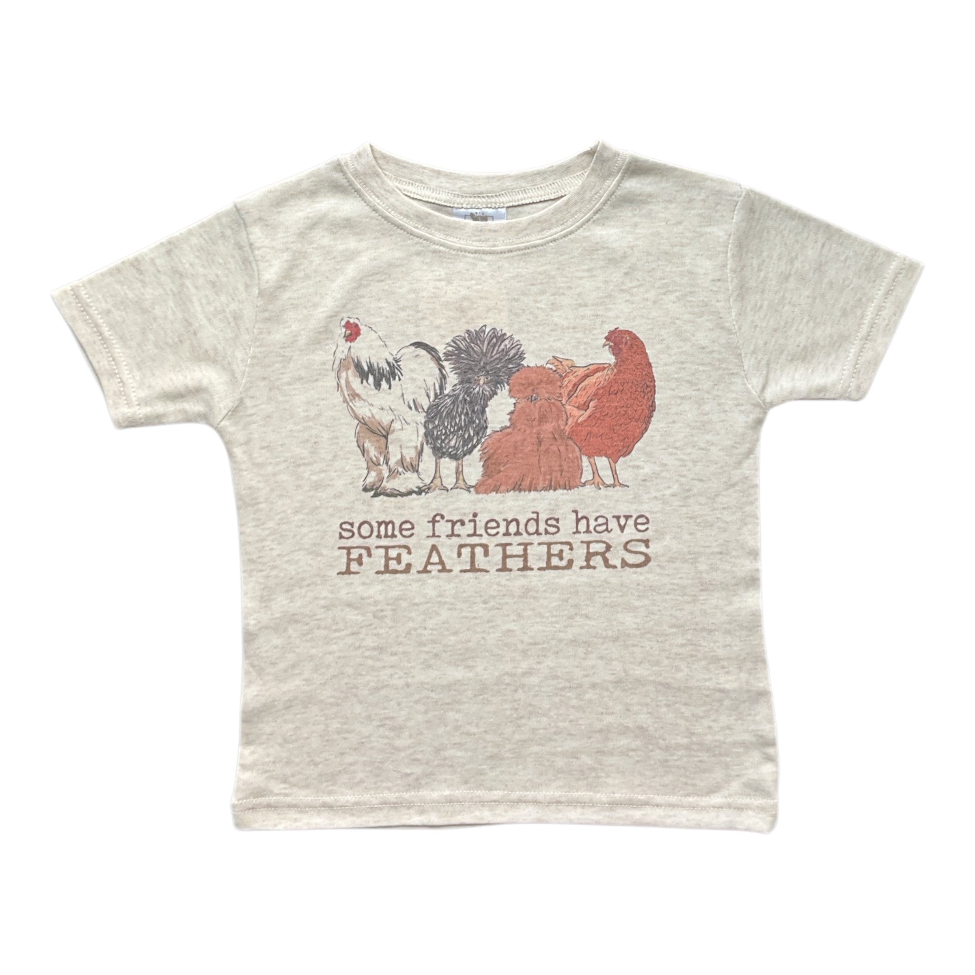 "Some friends have feathers" If you love chickens this tee is perfect! The imagery is realistic and fun and the shirt material is durable and soft- a combination kids will want to wear again and again!