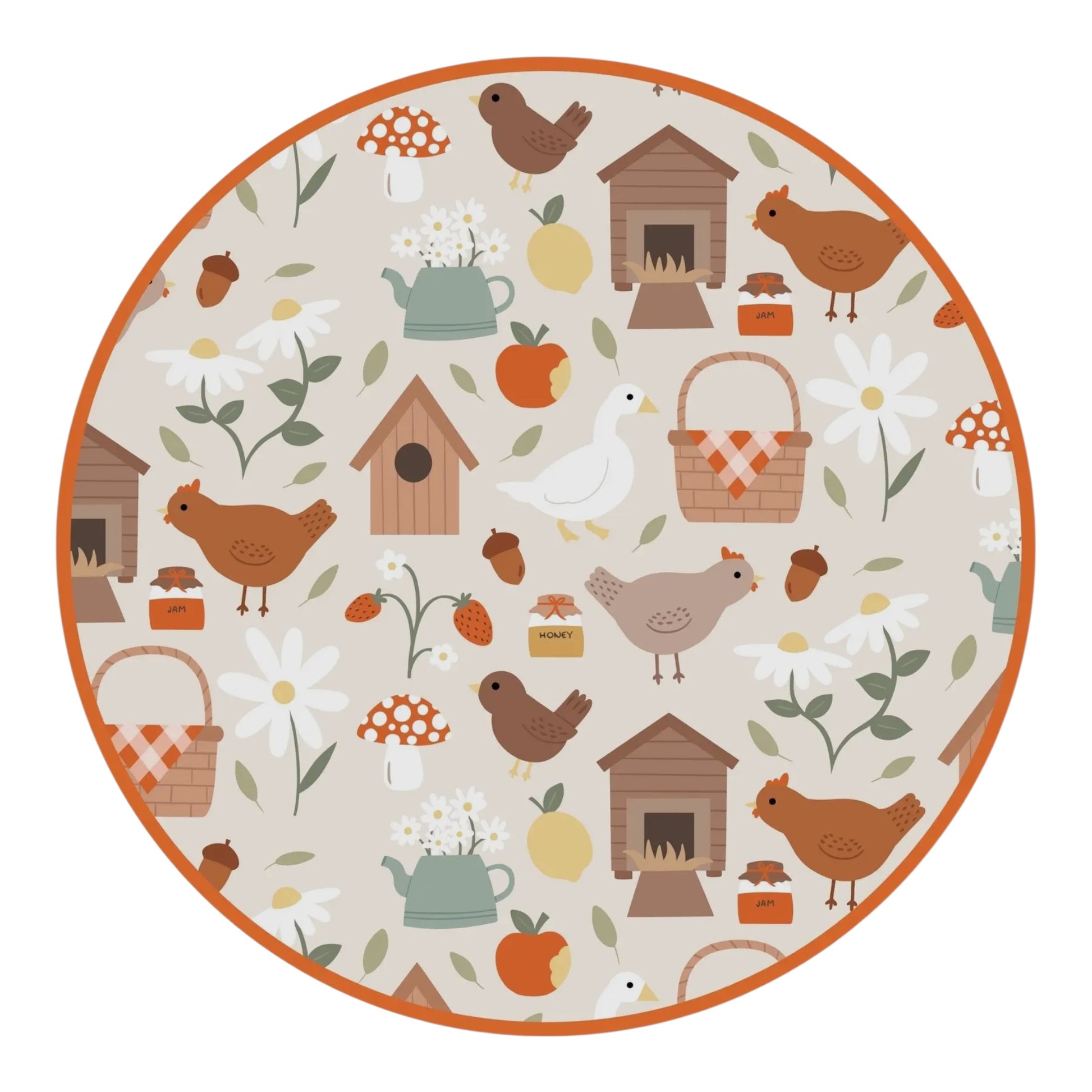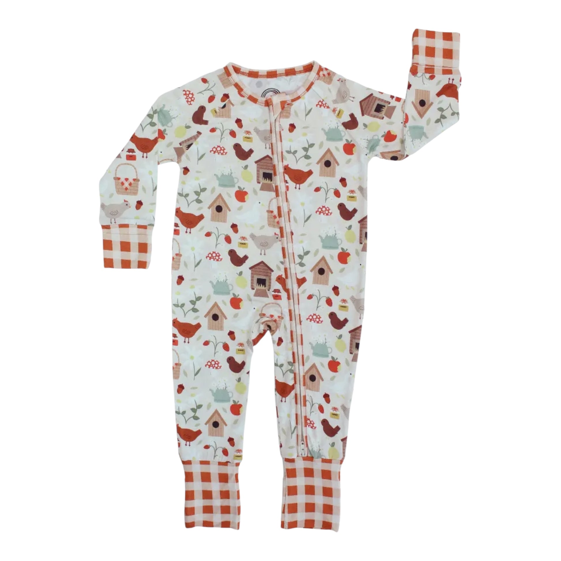 Comfort meets countryside charm in our Garden Coop Bamboo Zipper Romper. This cozy one-piece features an adorable print filled with chickens, apples, birdhouses, and watering cans, perfect for little ones who love farm life. The warm rust gingham cuffs and trim add a vintage touch that makes this romper both playful and timeless.