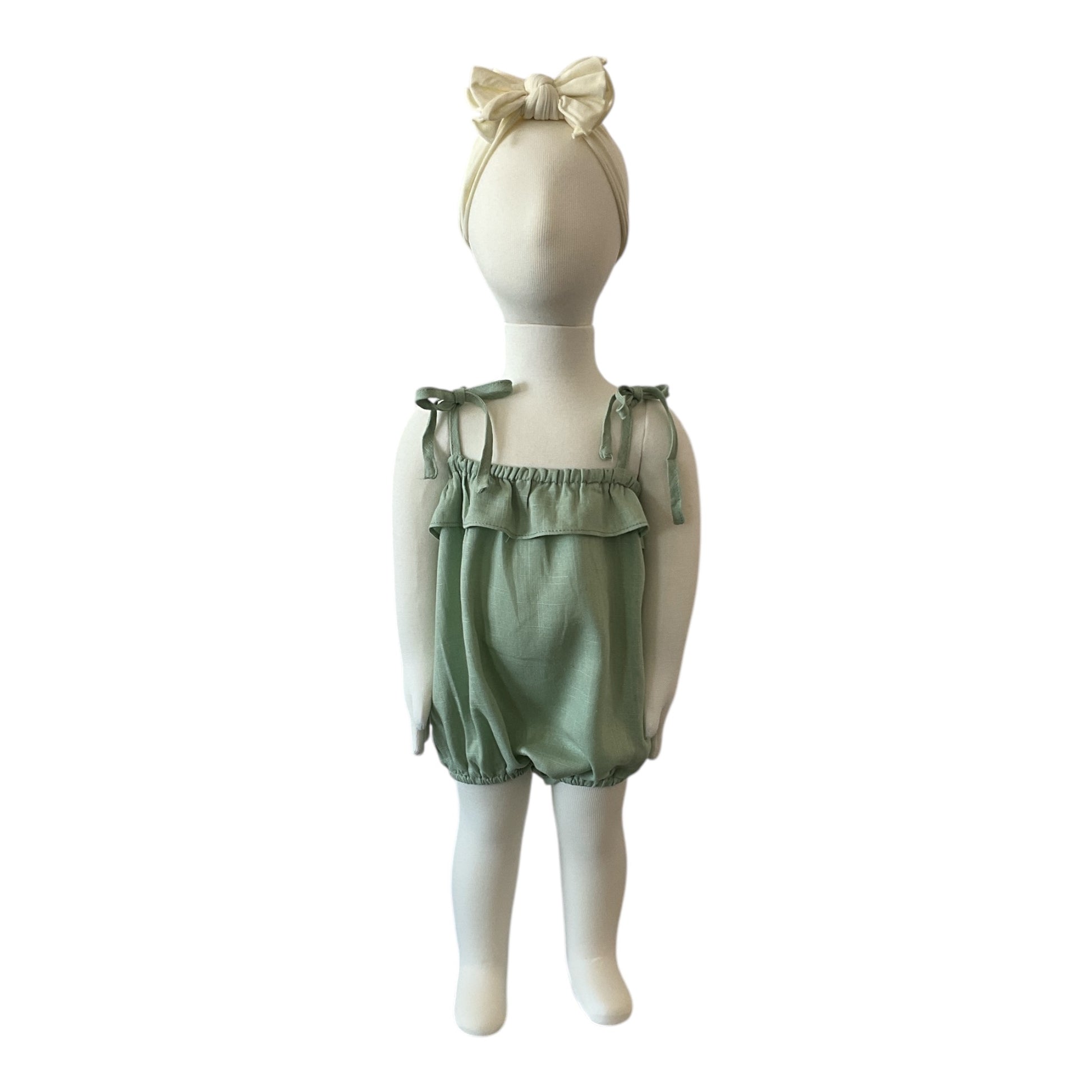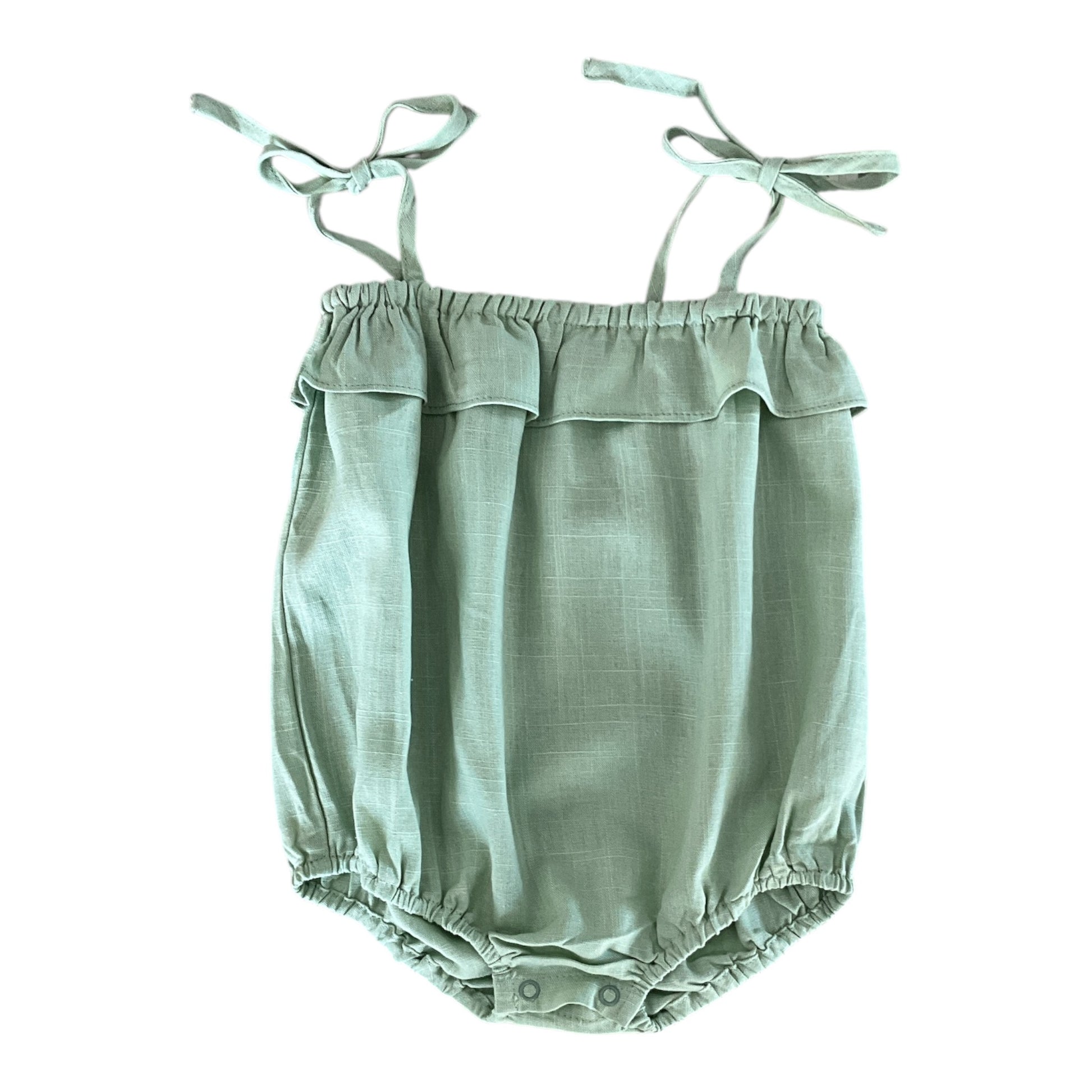Get your little one ready for a day of fun in the sun with this Green Strap Ruffle Linen Girl Bubble! The playful ruffles and airy linen fabric make it the perfect outfit for warm weather adventures. Say goodbye to boring outfits and hello to stylish comfort (and lots of smiles)!