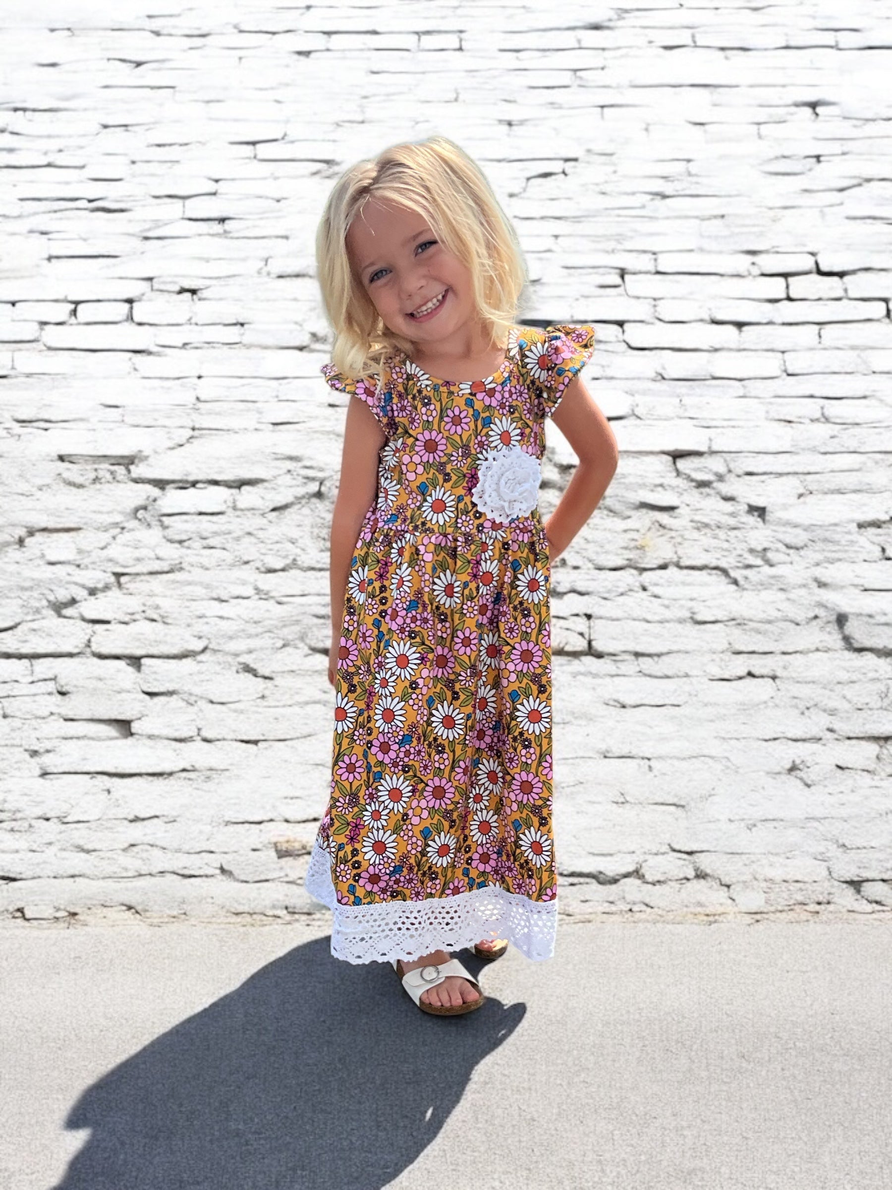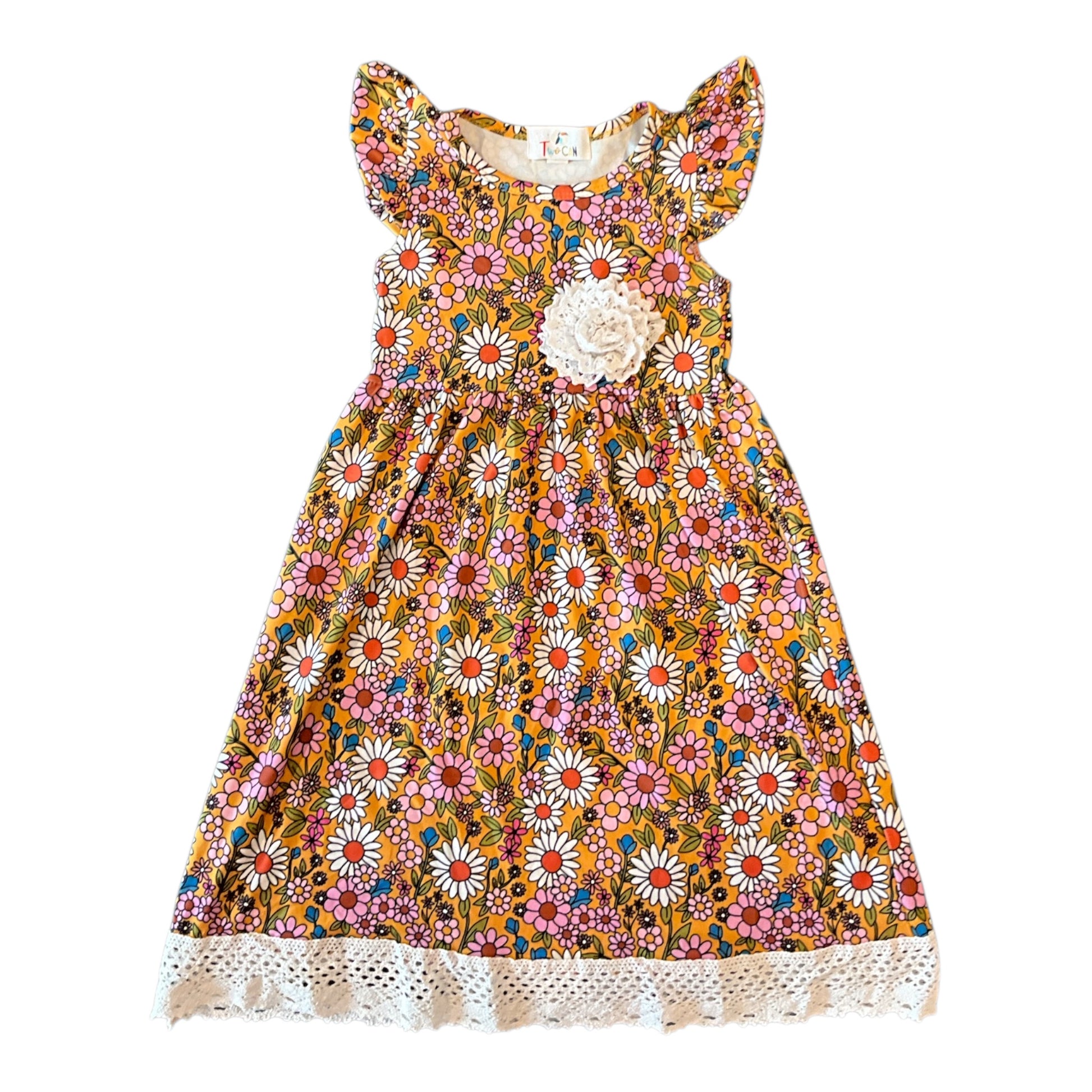 Mustard Daises with Lace Trim Dress