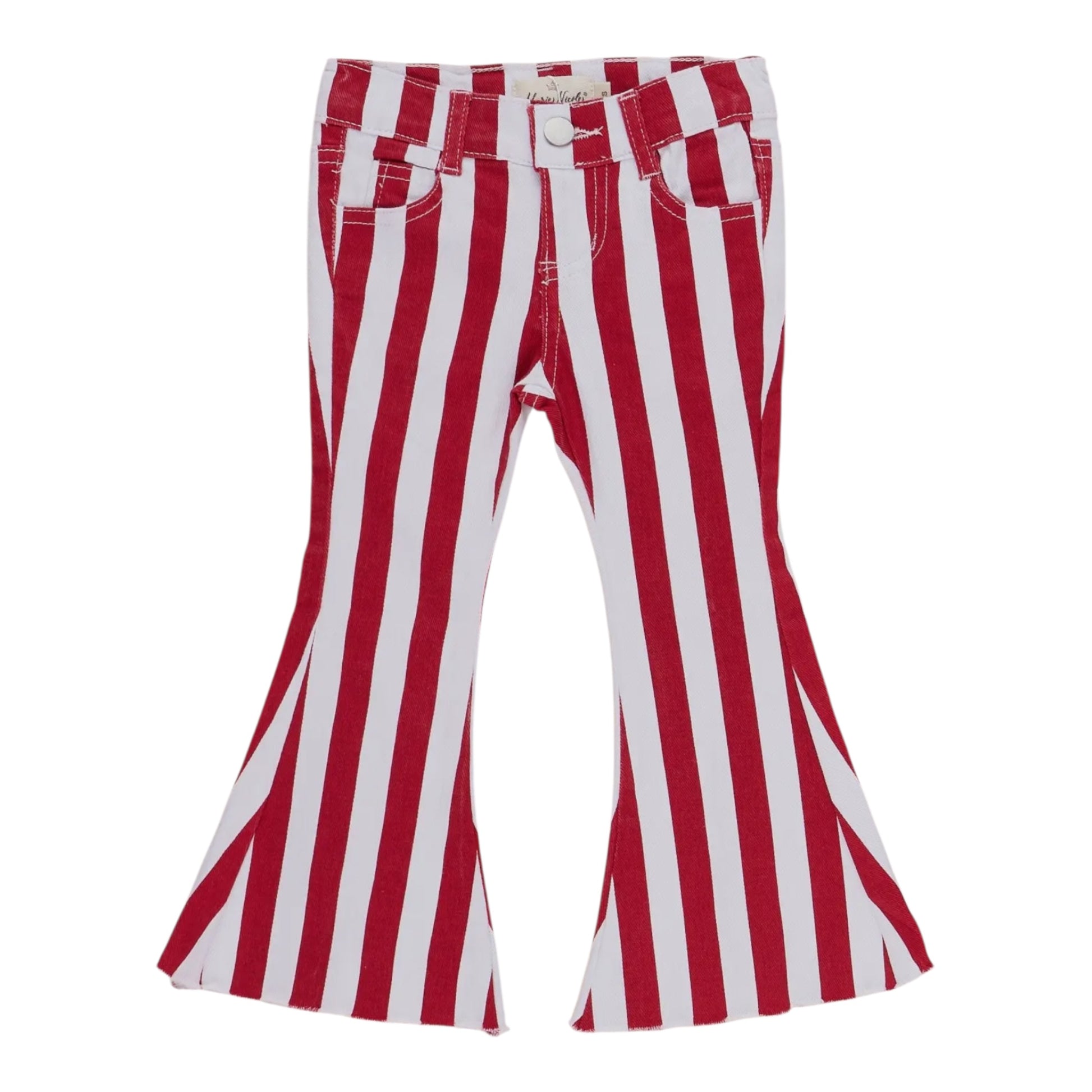 Add a bold and festive pop of style to your little one’s wardrobe with these peppermint striped denim bell bottoms! Featuring bright red and white vertical stripes, these pants bring retro flair with a fun holiday twist. The flared leg design adds playful movement, while the soft, stretchy denim blend ensures all-day comfort for playdates, parties, and picture-perfect moments.