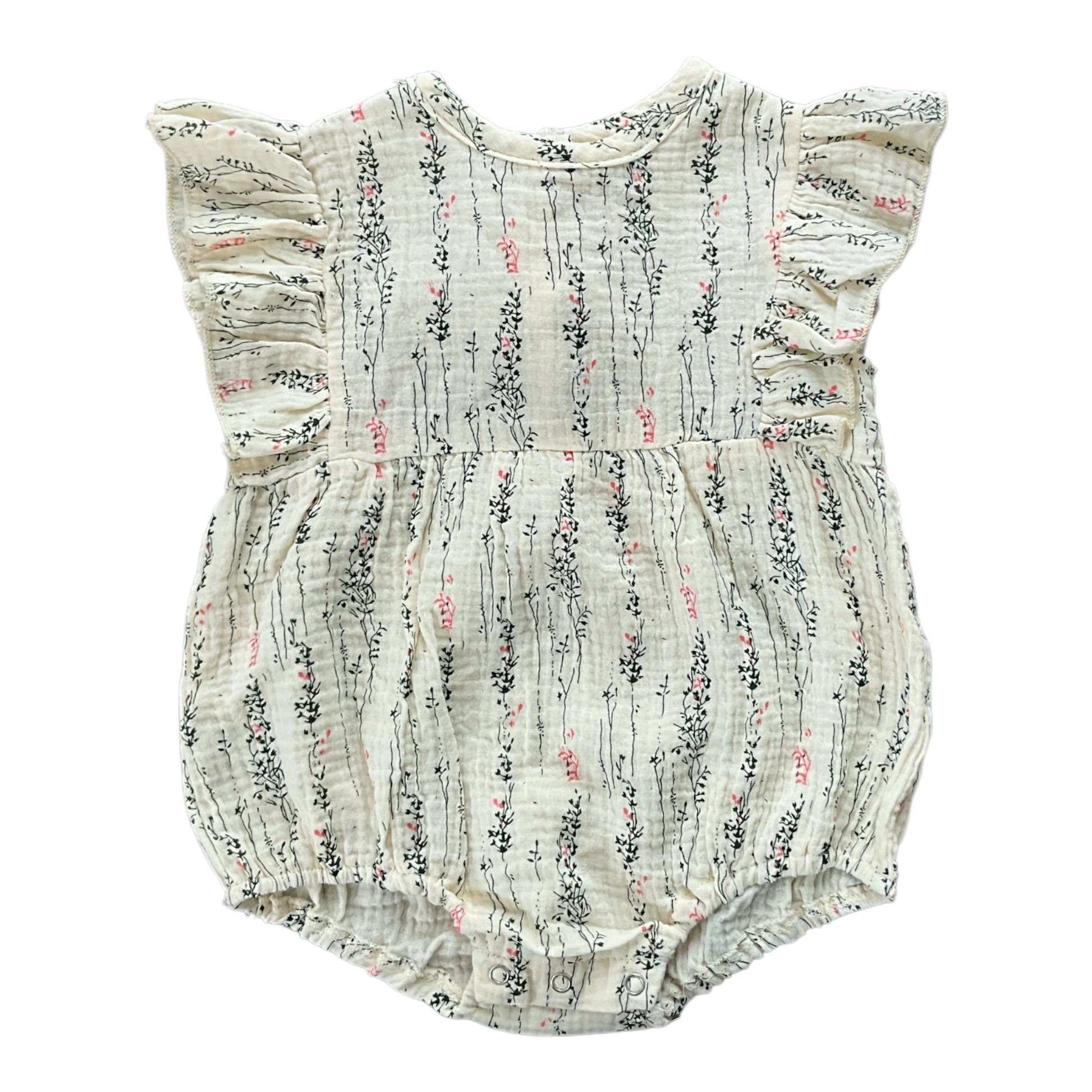 This pink and green ivy bubble is perfect for spring and summer. Made from 100% cotton, it is light and airy, making it comfortable to wear all day long. It has 3 metal button on the crotch, making for easy diaper changes. The 3 wooden buttons down the back and the ruffle cap sleeves are the perfect addition.