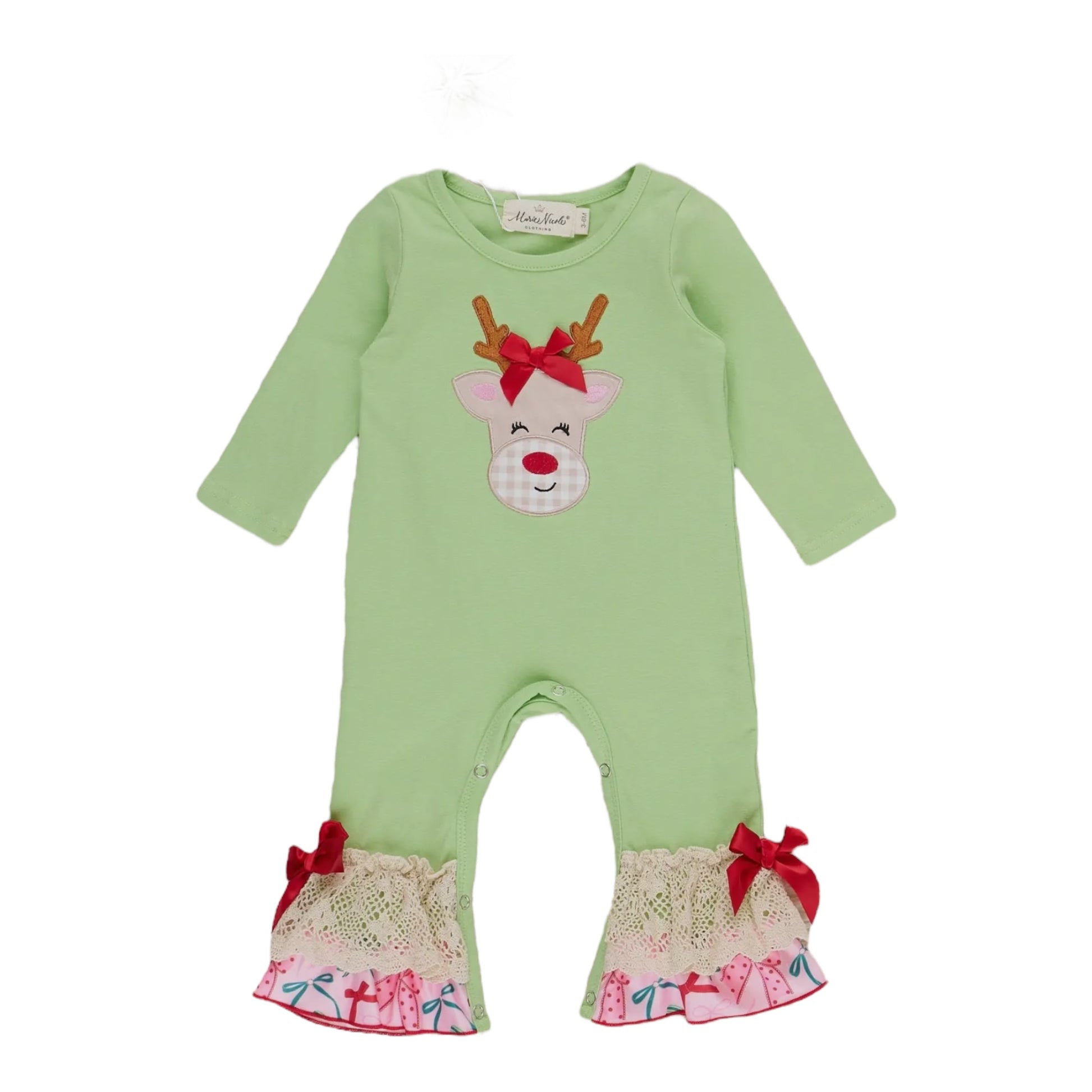 Your little one will be ready to shine bright this holiday season in this adorable reindeer romper! The soft mint green fabric is accented with a sweet reindeer applique, complete with antlers and a festive red bow. The ruffle-trimmed legs feature lace and printed ribbon details with little red bows, adding the perfect finishing touch. With snap closures for easy changes, this romper is as practical as it is picture-perfect for Christmas gatherings, holiday photos, or cozy winter days.