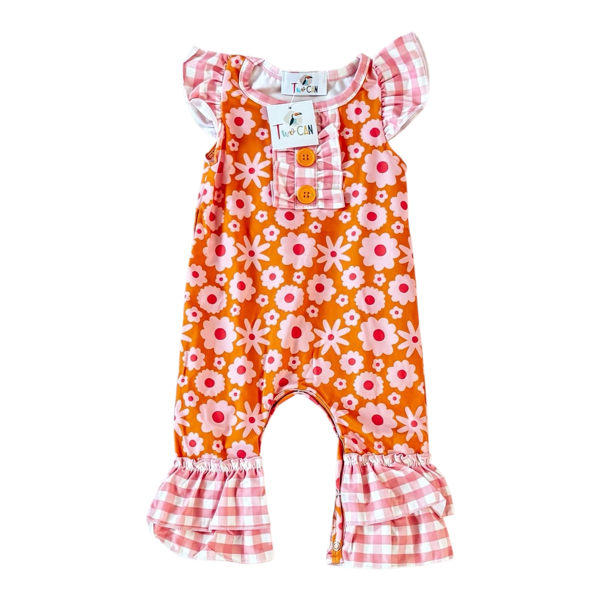 Bring on the flower power! This darling baby romper is full of retro charm with its vibrant daisy print and pink gingham ruffles. Comfy, sweet, and photo-ready—it’s perfect for your littlest sunshine.