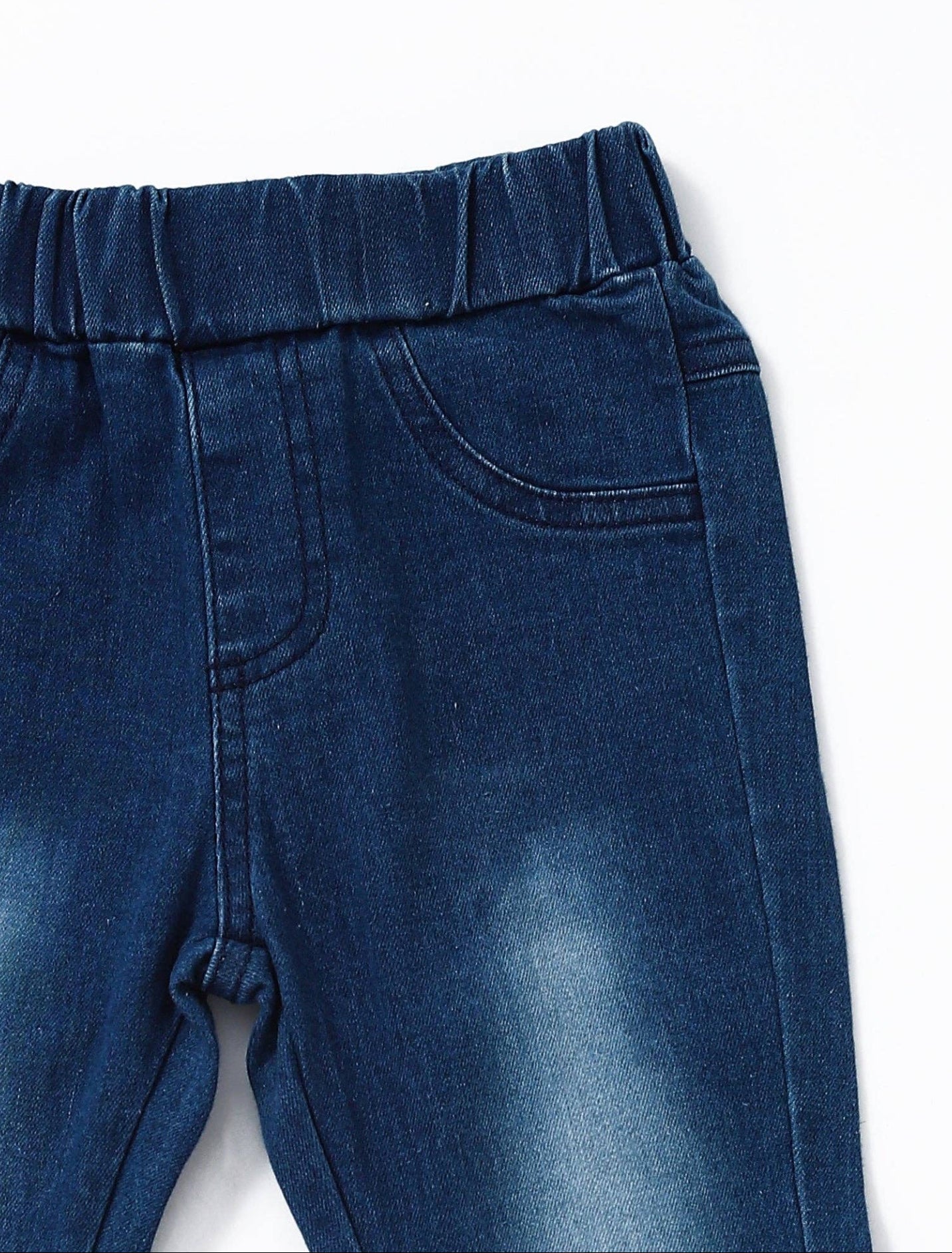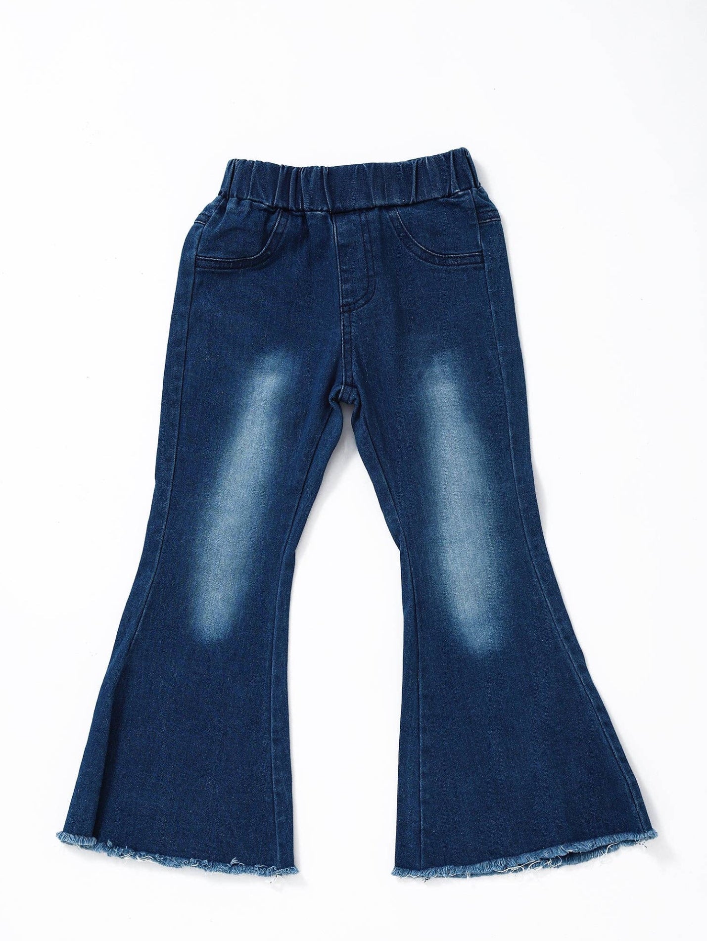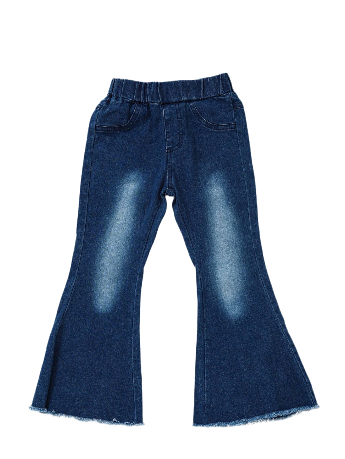 These jeans are an absolute need for her closet. They have an elastic waistband and a flare leg with a frayed hem line.